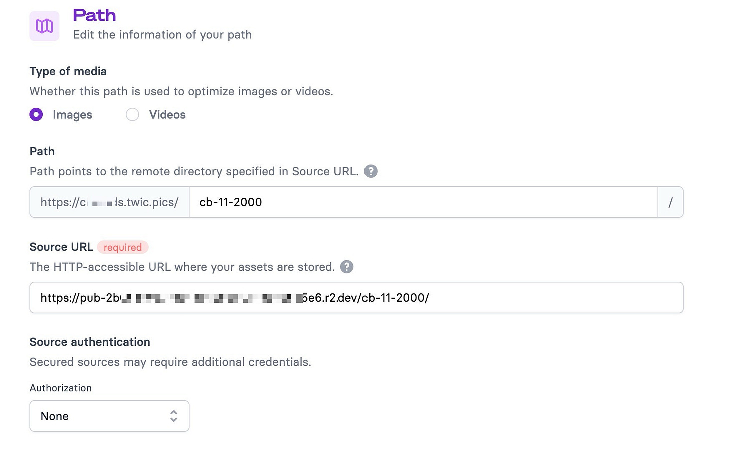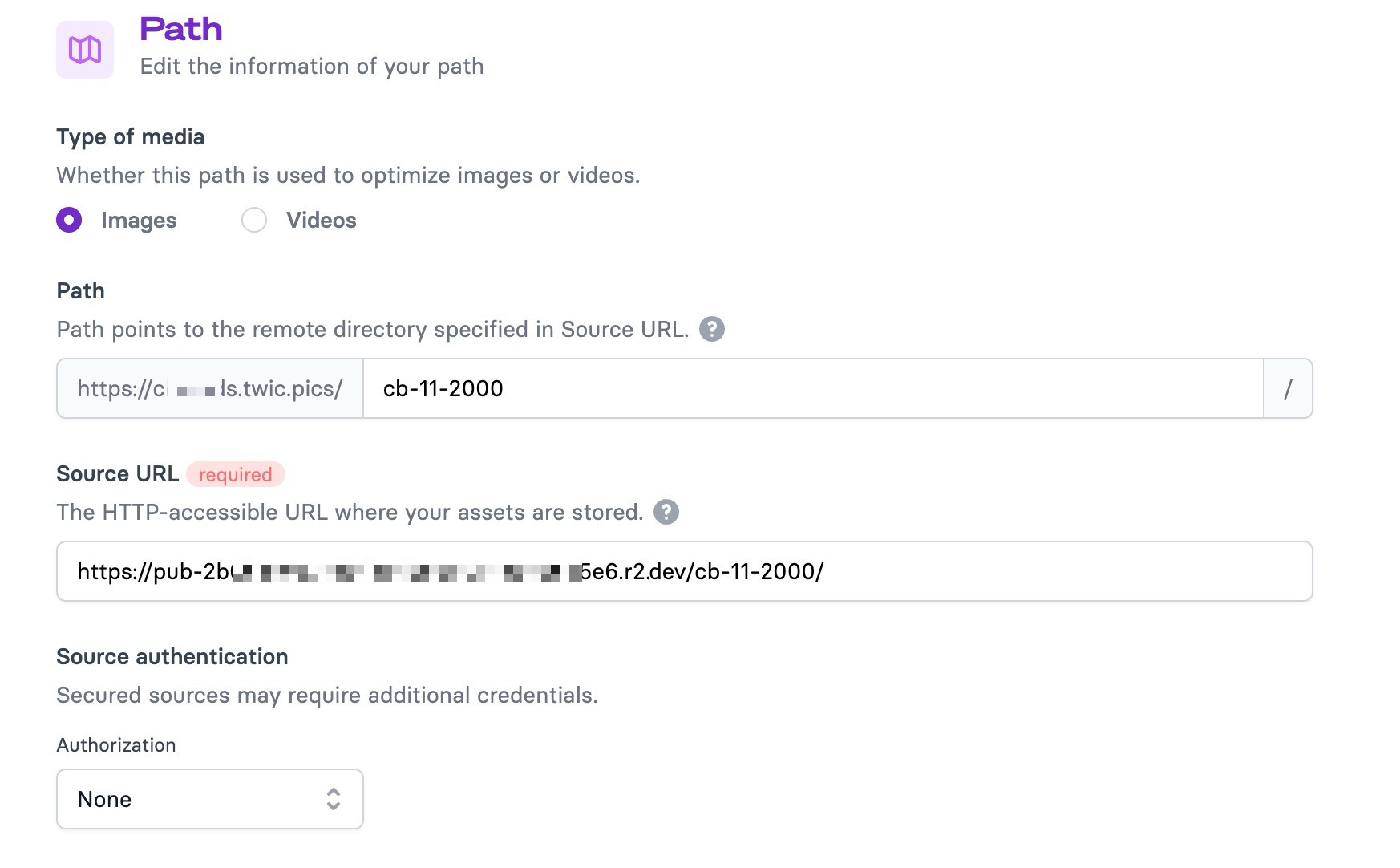 For the Source URL, I added the same and that means that in the R2 bucket, we actually have a directory called “cb-11-2000”. Why? Because maybe we want to host different types of source images. Perhaps next month I will host a new brand called Rolex and I will need source images of 3000px; in this case I might create a directory called “RX-11-3000”.